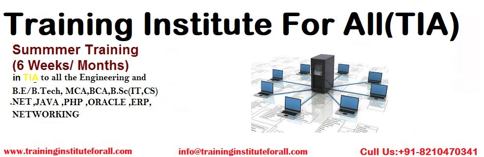 Training Institute For All(TIA) offers IT Training, Summer Training for BCA, MCA, B.E., B.Tech, M.Tech Students, Professionals, Developers and we provide Corporate training for small, Medium and large Organizations who want to upgrade Skills in latest Technology. We also provide affordable and custom Software Development services, Website Developing and Designing Services to small, medium, and large Organizations across India.We Training Institute For All(TIA) would like to introduce ourselves - a team of fully qualified professionals in the field of IT Training and development. Our operating Office solely based in sec-2, Noida (India).